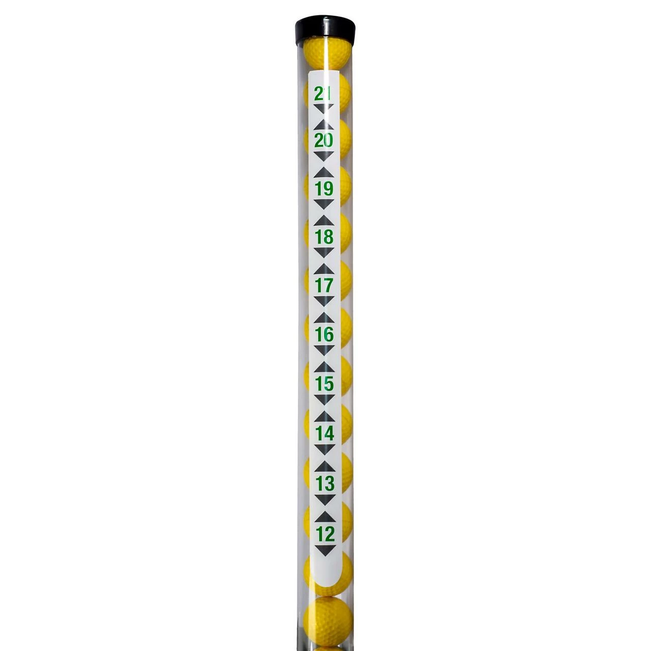 22 Limited distance practice balls in a lightweight trigger action shag tube.
