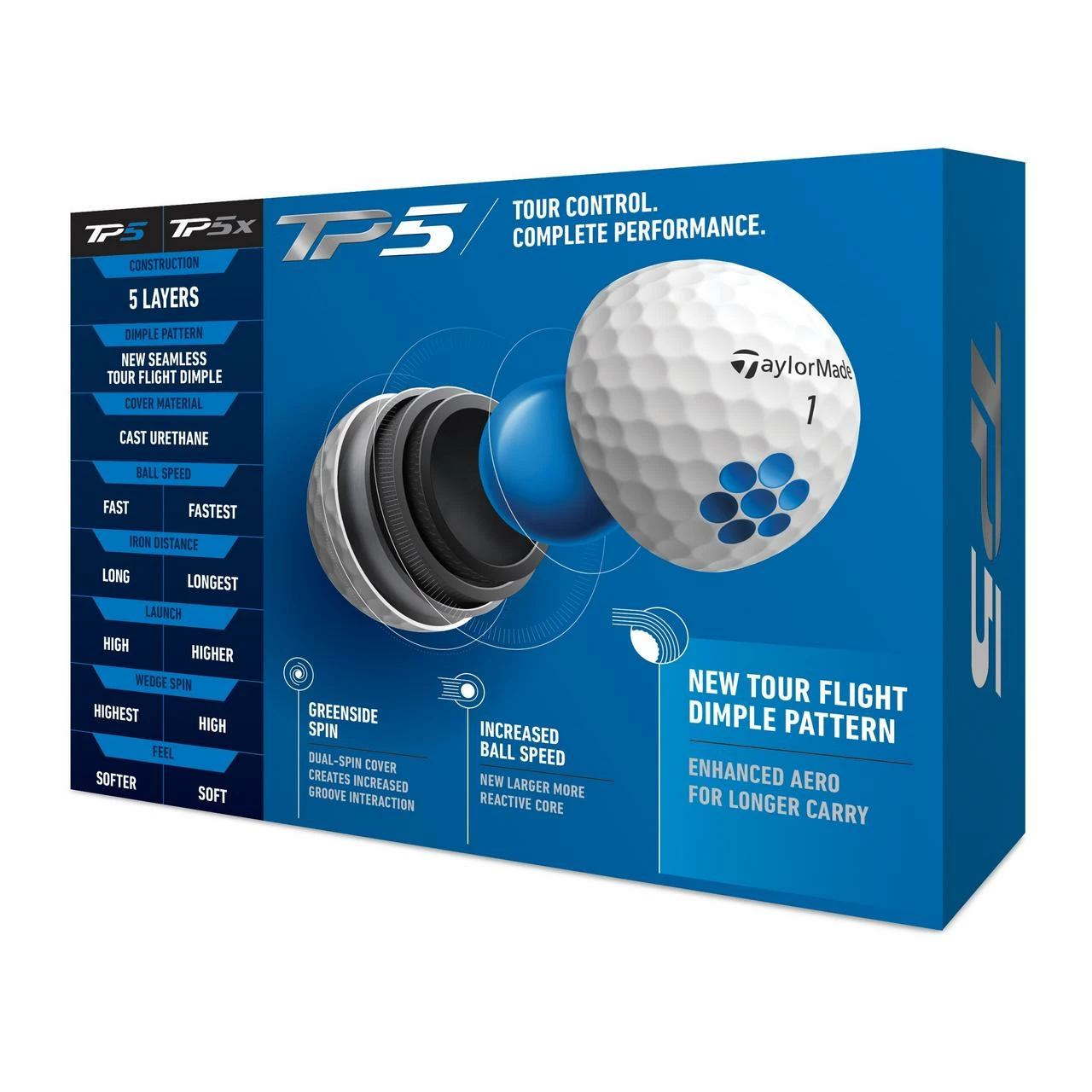 The key to achieving enhanced speed without negatively affecting spin performance comes from TaylorMade’s proprietary 5-layer ball construction. Including a larger and more reactive Tri-Fast Core that delivers maximum carry and low drag and a Dual-Spin Cover that features an ultra-soft, highly durable cast urethane cover, TP5 offers complete tee-to-green performance without sacrifice. The ultimate result is a ball that promotes a fast launch, maximum carry distances and a steep angle of descent for extra stopping power – especially on long irons.