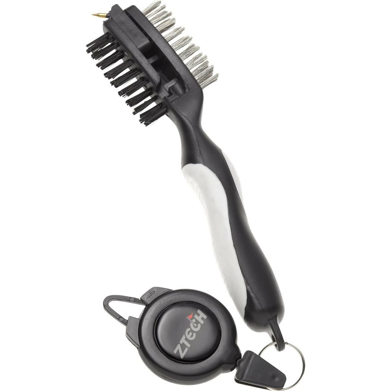 The ZTech Universal Club Brush with Retractable Cord comes with a nylon brush for woods on one side and a wire brush for irons on the other side. It also has a unique metal groove cleaner to keep your clubs in tip-top condition, while the retractable cord allows for easy attachment to your golf bag.